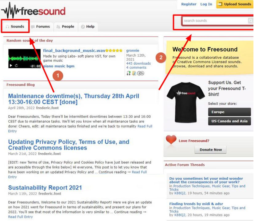 如上图所示,我们可以点击图示标注1所示的“Sounds”来浏览和在线试听音效,觉得不错的话可以将音效下载下来,我们也可以通过图示2标注所示的搜素框来搜素音效,找到自己喜欢的音效下载到本地使用。
