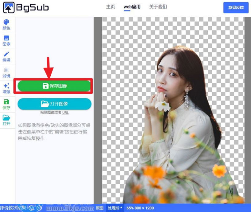 4、图片上传完成后,该在线工具会自动识别图片中的人像和背景部分,自动去除图片的背景,直接为我们展示抠图后去除了背景的图片效果,我们点击“保存图片”即可将其下载到本地使用。