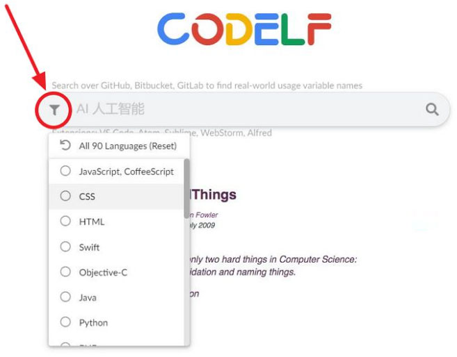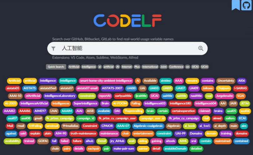 CODELF是一个变量命名神器,能够帮助我们非常方便高效的实现变量命名,该工具通过搜索在线开源平台Github, Bitbucket, Google Code, Codeplex, Sourceforge, Fedora Projec的项目源码,帮开发者从中找出已有的匹配关键字的变量名。这个搜索服务支持直接搜索中文,支持中文查询,输入中文意思,可以根据需要查询尽可能满足需要的结果,并展示与查询结果相关的支持各种编程语言的代码片段以及代码库。