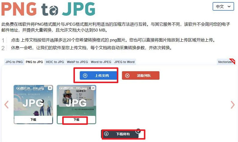 2、打开该在线工具后如上图所示,我们点击“上传文档”,选择需要转换格式的png图片,支持批量上传转换,png图片上传完成后自动就和转换成了jpg格式,我们可以直接点击“下载”按钮就可以下载对应转换好的jpg图片,如果图片较多,也可以点击“下载所有”按钮将转换好的图片打包下载到本地。