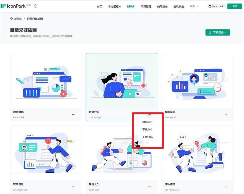 3、接下来来看看插画库,如上图所示,我们选择自己喜欢的插画,可以直接复制svg、下载svg或是下载为png。