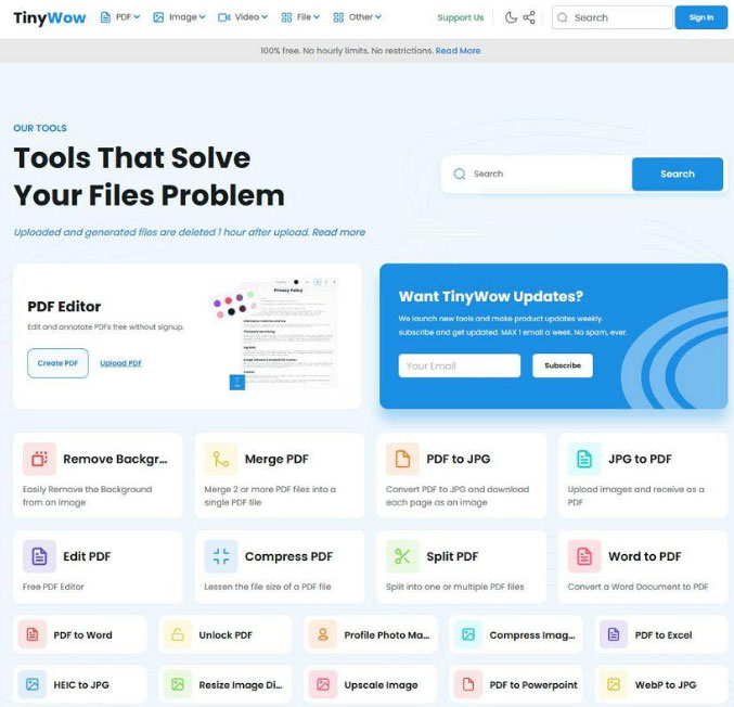 tinywow是一个文件全能王在线工具,能够帮助我们在线转换任何格式的文件,无论是pdf文件、图片文件、word文件、excel文件、pprt文件、视频文件、音频文件、文本文件、电子书文件等,都能实现各种格式之间的转换,而且完全免费使用。