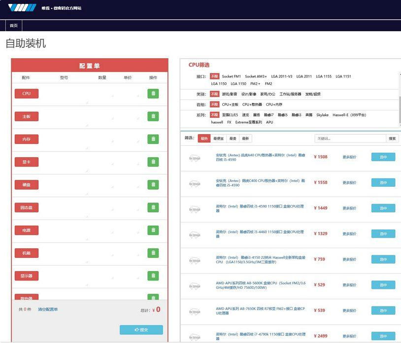唯我自助装机提供了在线模拟装机服务,我们可以通过自己在线选择CPU、主板、显卡、内存、硬盘、机箱、电源、散热器、显示器、光驱、鼠标、键盘、音响等,并且为各项硬件提供了参考价格。