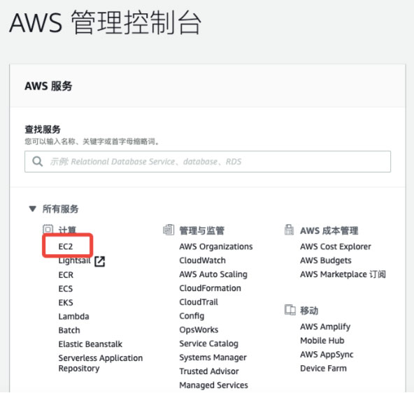 执行完上述操作后,会进入AWS管理控制台,在搜索框中输入EC2进行搜索,或点击所有服务中的EC2,进入EC2控制面板。