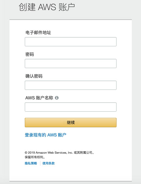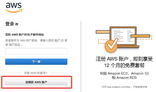 如果我们还没注册过AWS帐号的话,访问亚马逊官网,点击创建新AWS账户按钮。