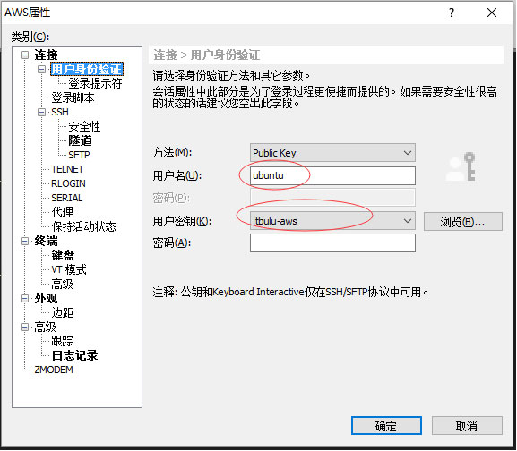 用户身份验证中帐号填写ubuntu,密码选择刚才下载的密钥。