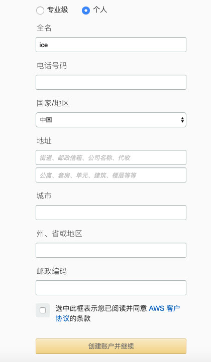 接下来,需要完善个人基本信息,包含:姓名、国家/地区、地址、电话号码等内容,填写完之后点击创建帐号并继续按钮。