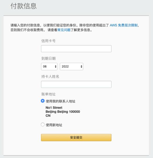 输入支持双币的信用卡卡号,信用卡到期年月、持卡人姓名,选择联系地址,点击继续按钮,会扣除1美元作为卡验证费用。