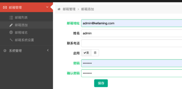 点击左侧菜单中的邮箱添加,添加一个需要收发邮件的帐号。
