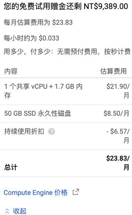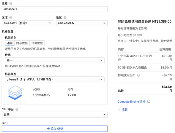 填写名称,选择区域,机器类型等内容,右侧会显示每月的费用,注意累计费用不要超出赠金总额。推荐选择 1 个共享 vCPU + 1.7 GB 内存。