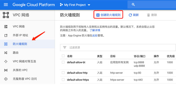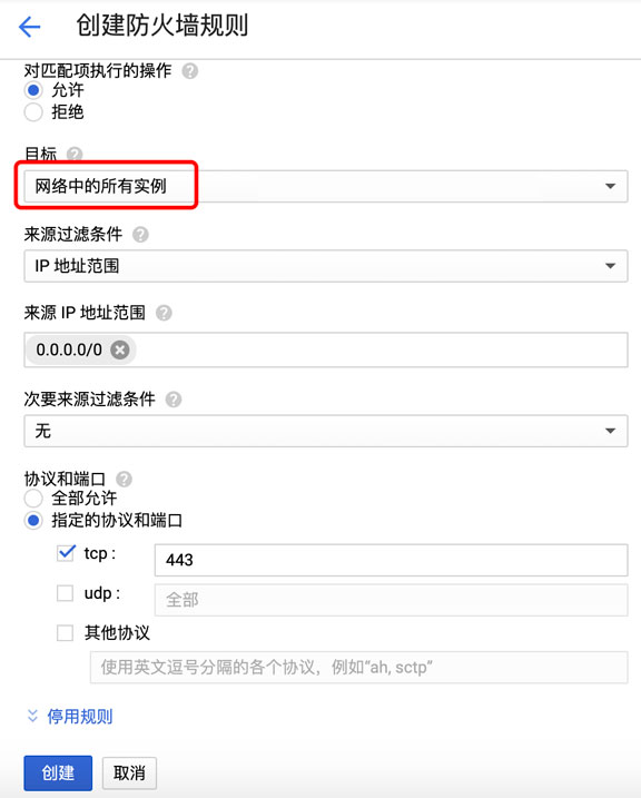 创建防火墙规则,需要注意的是,目标一栏选择“网络中的所有实例”,不然外网无法访问。