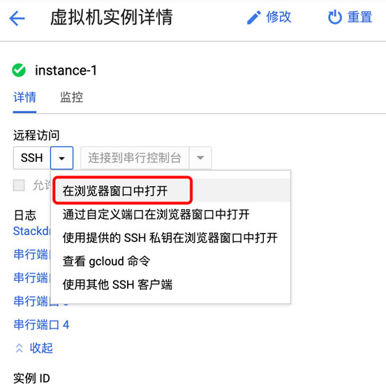 点击实例名称,在虚拟机实例详情页面“远程访问”选择 SSH,并在浏览器窗口中打开。