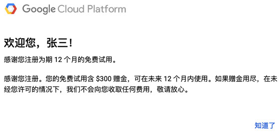 填写完上述资料后,点击“开始免费使用”按钮,便提示已成功注册。获得 300 美元的赠金,一年内有效,而且承诺如果赠金用完,不会主动扣费。