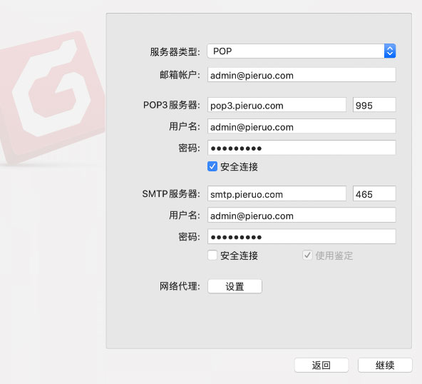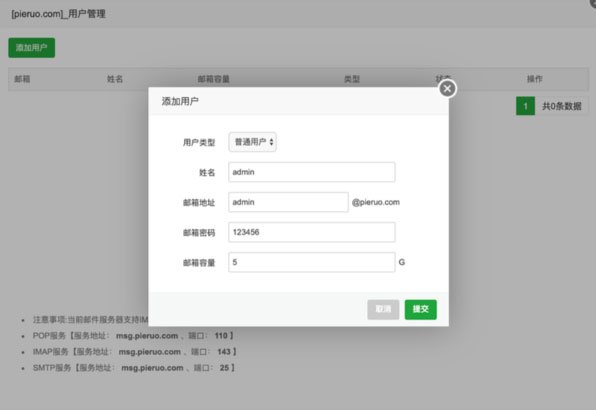 需要在域名服务商管理控制台添加 pop3.pieruo.com 和 smtp.pieruo.com 这两条解析记录,记录类型为 CNAME,记录值为:msg.pieruo.com.