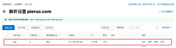 登录域名服务商管理控制台,配置一条域名解析记录,记录类型为 “A”,主机记录值为 “msg”,记录值为服务器的公网 ip 地址。
