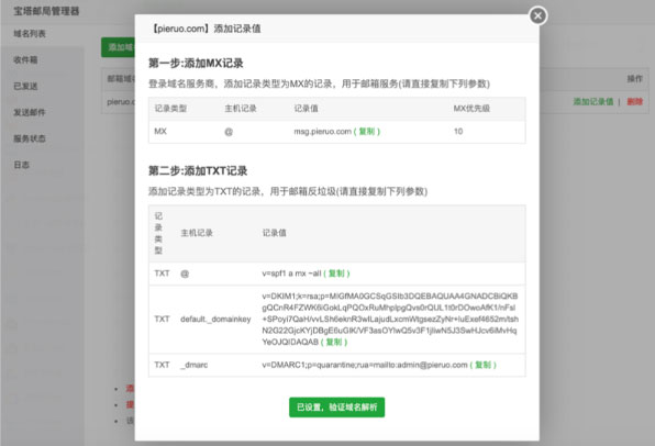 之所以要添加这样的一条记录,它起到了一个纽带或者桥梁的作用,邮箱根域名 pieruo.com 需要解析到此记录上。上面的 “msg” 可以是任意值。