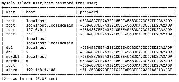 select user,host,password from user;